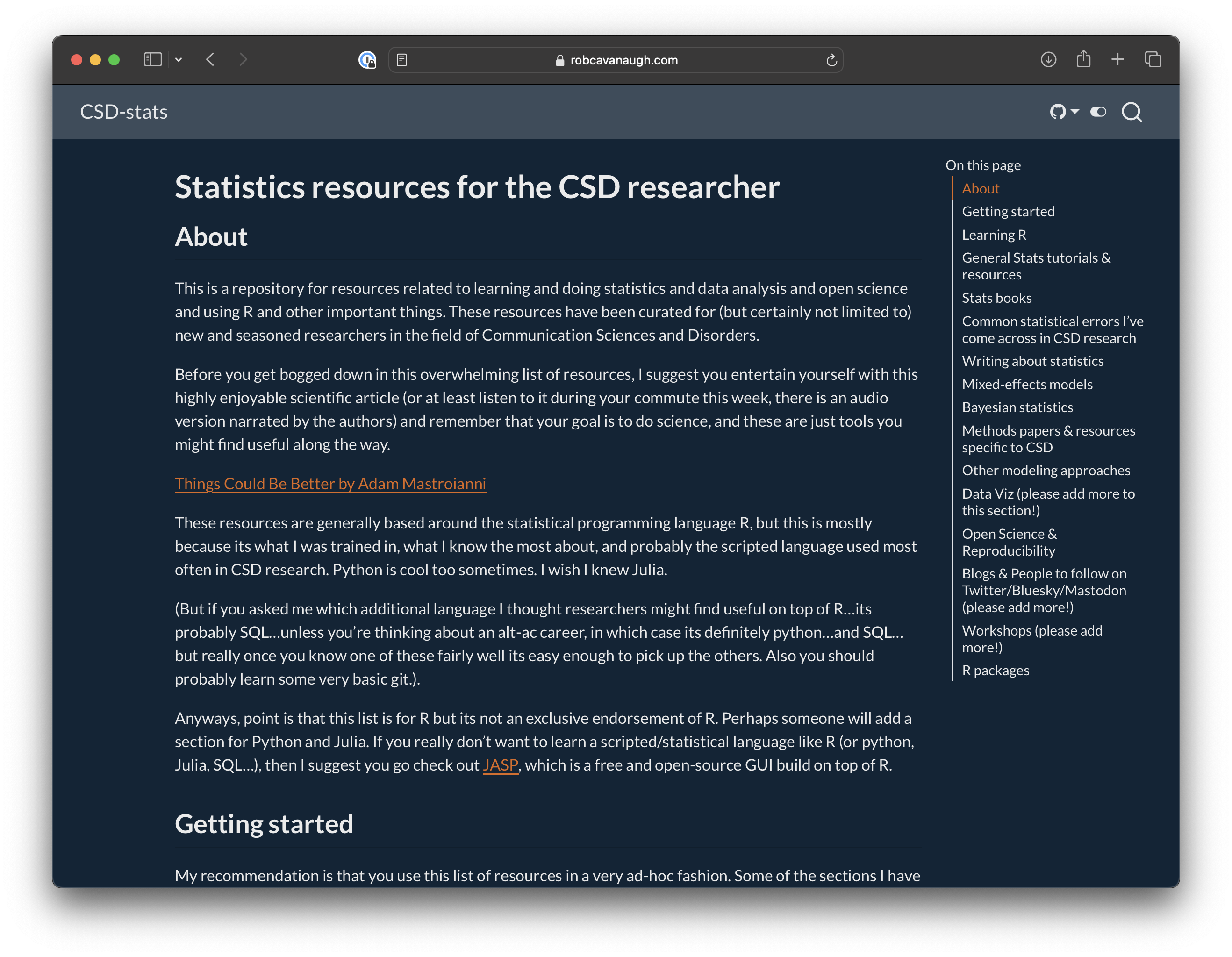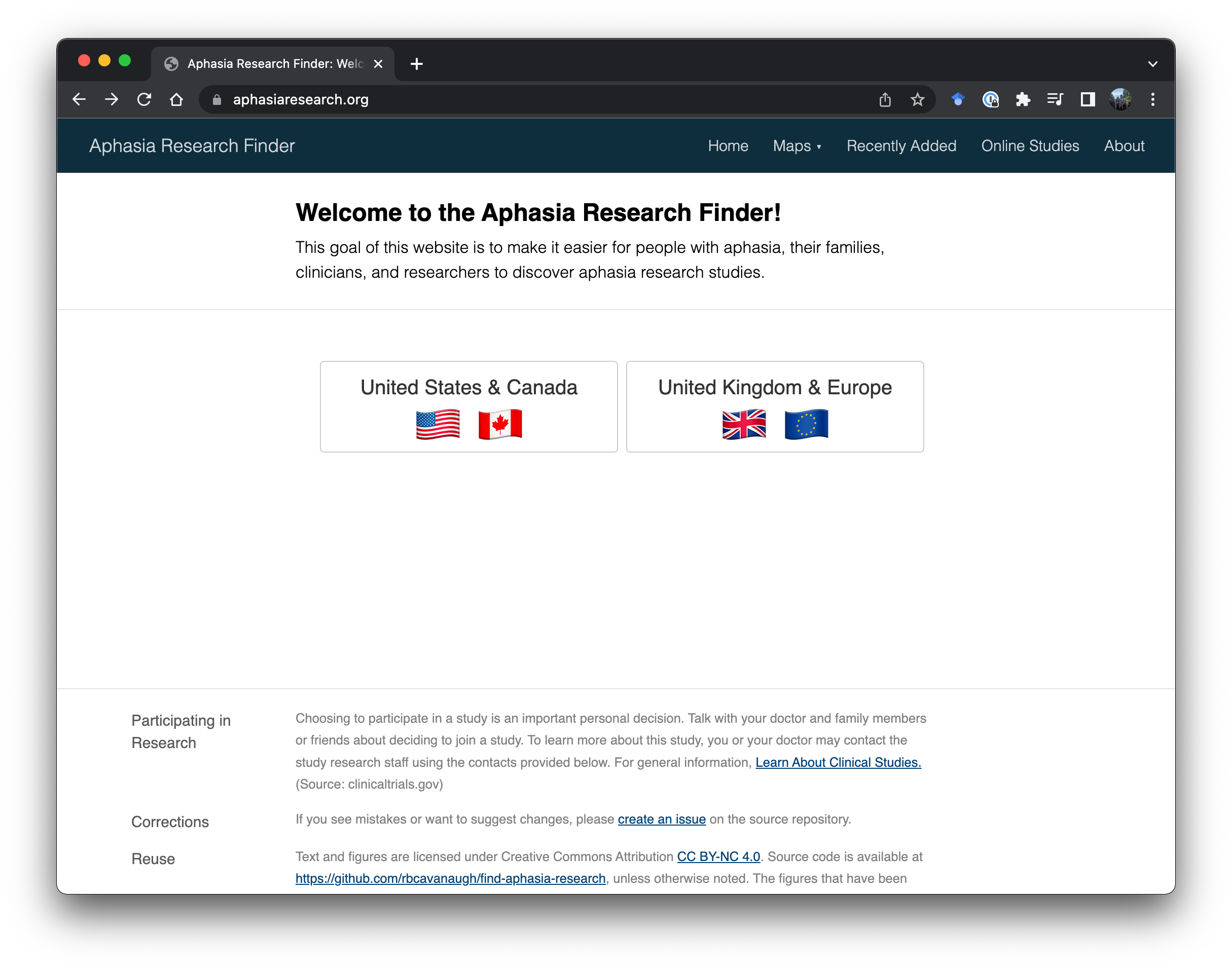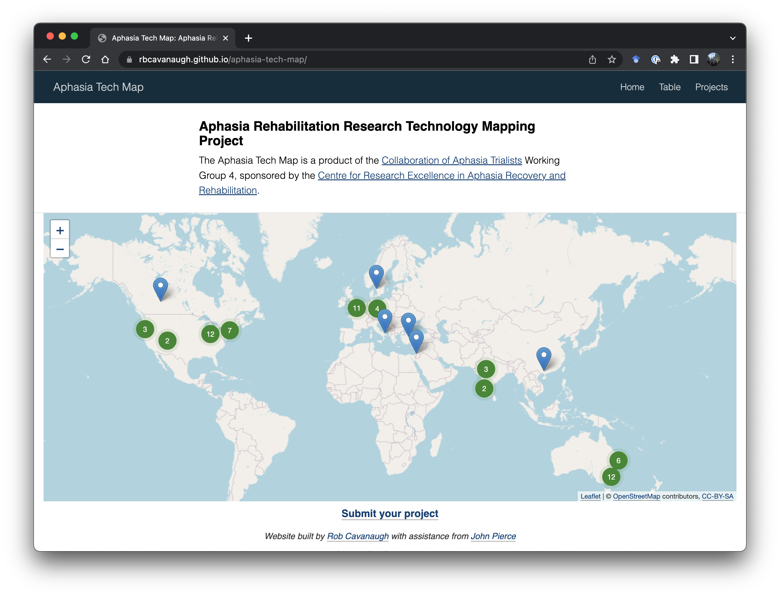 There are also some static websites for disseminating information, such as the recent CSD Statistics resource page, which was commissioned by Will Evans to provide a single location resource for CSD PhD students who want to learn R or increase their statistics skillset. The Aphasia Tech Map was the result of a collaboration with John Pierce and Miranda Rose as part of the Collaboration of Aphasia Trialists Aphasia Rehabilitation Research Technology Mapping Project. And the Aphasia Research Finder originated from a challenge we frequently came across at Pitt - that there was no aphasia-friendly resource to help individuals with aphasia find research opportunities close to them or help them contact researchers. The website scrapes data from clinicaltrials.gov and displays it on a map, with suggestions for how to reach out to researchers. More recently, the National Aphasia Association has created a database for this purpose.