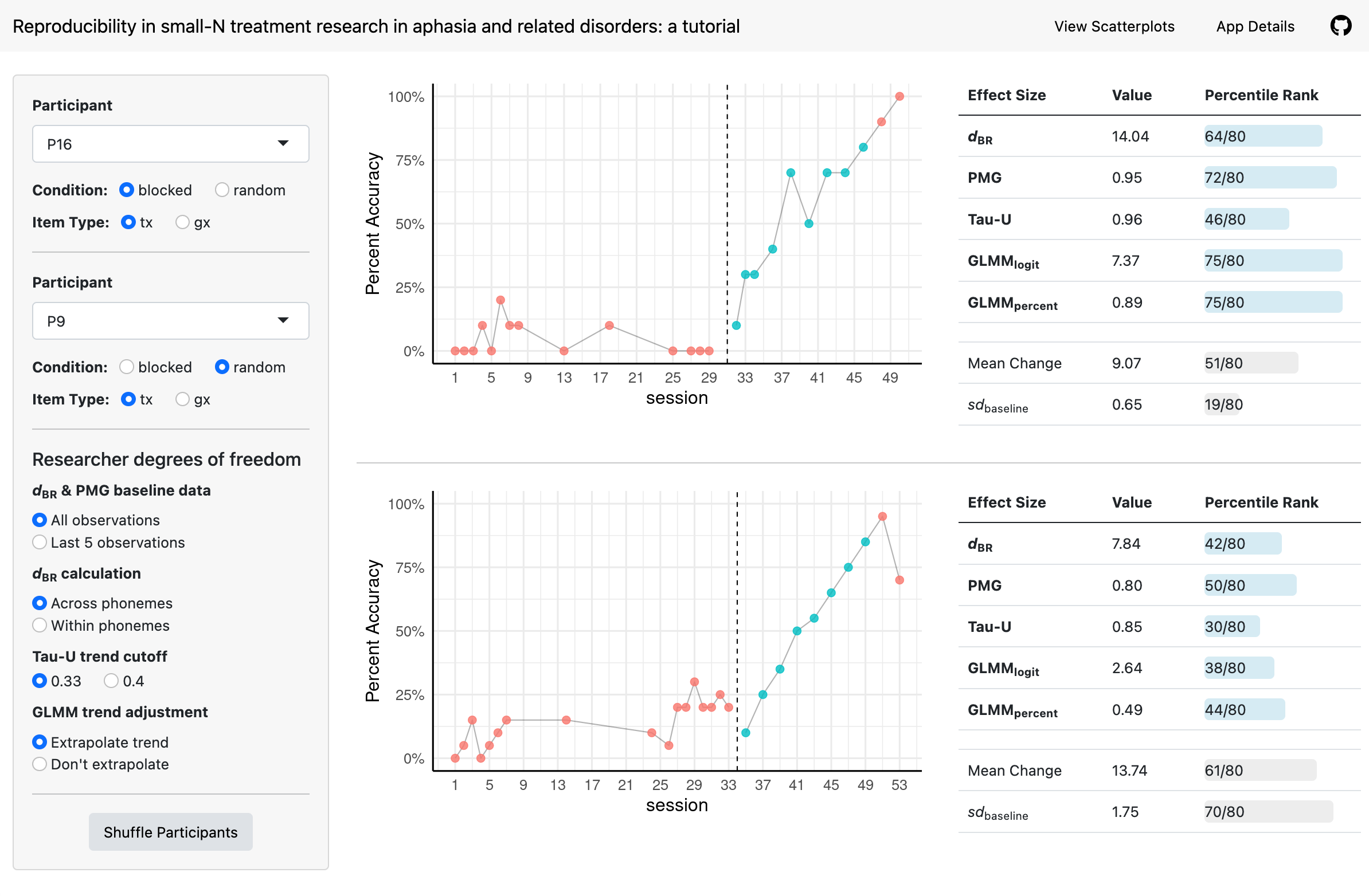 This page includes web apps and other websites I’ve created since my time as a PhD students at the University of Pittsburgh. Some are R Shiny apps built with the goal of improving research dissemination or communicated complex statistical principles. There are examples of assessment web-apps for aphasia, including the computer adaptive Philadelphia Naming Test, computer adatpive Aphasia Communication Outcome Measure, as well as non-transcription based discourse measures - core lexicon and main concept analysis. These web-apps are the result of collaborations with aphasia researchers who developed the assessments and were looking for ways to make them more accessible to clinicians and researchers. I have also used R Shiny to create web-apps for disseiminating methods research and explaining statistical concepts.